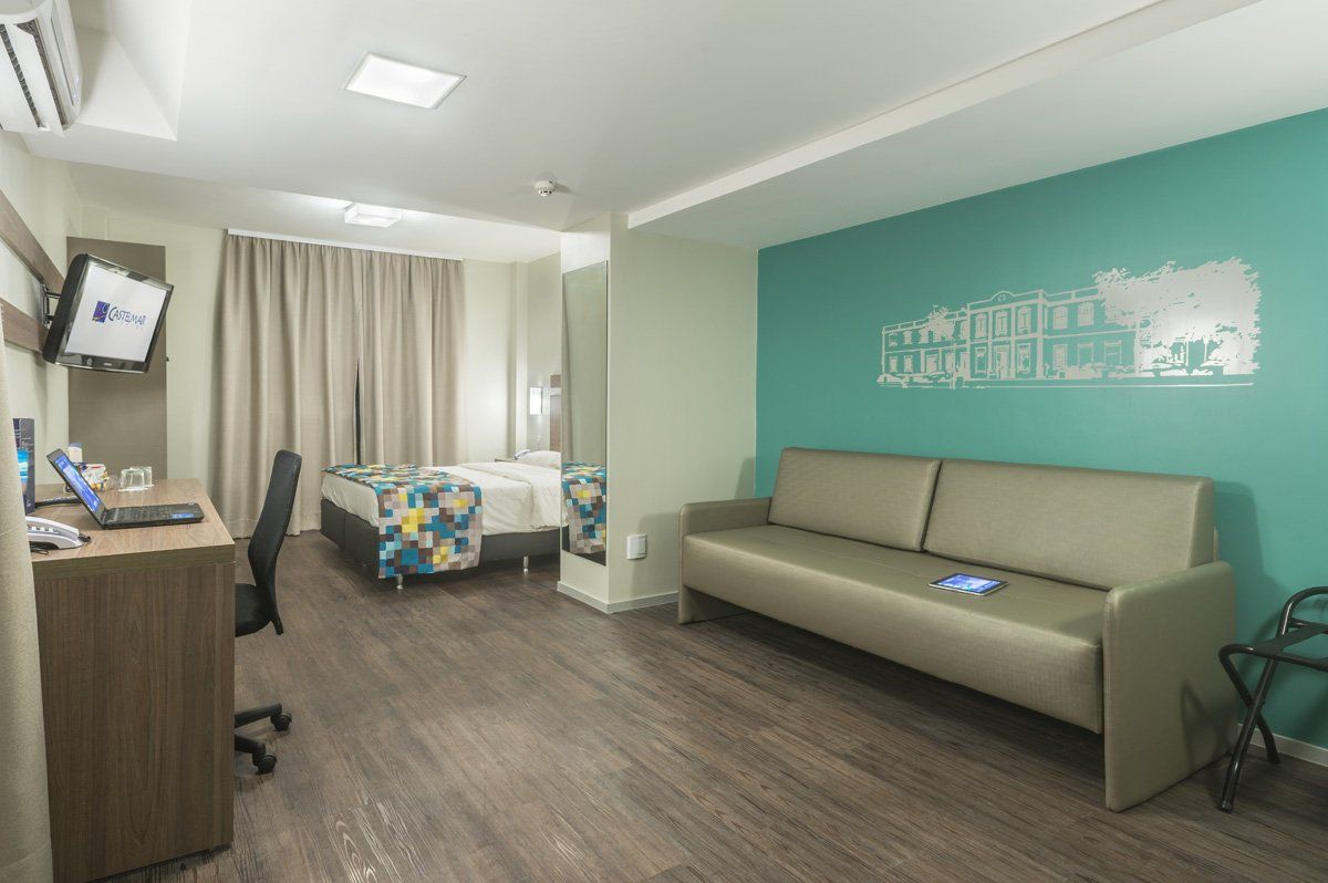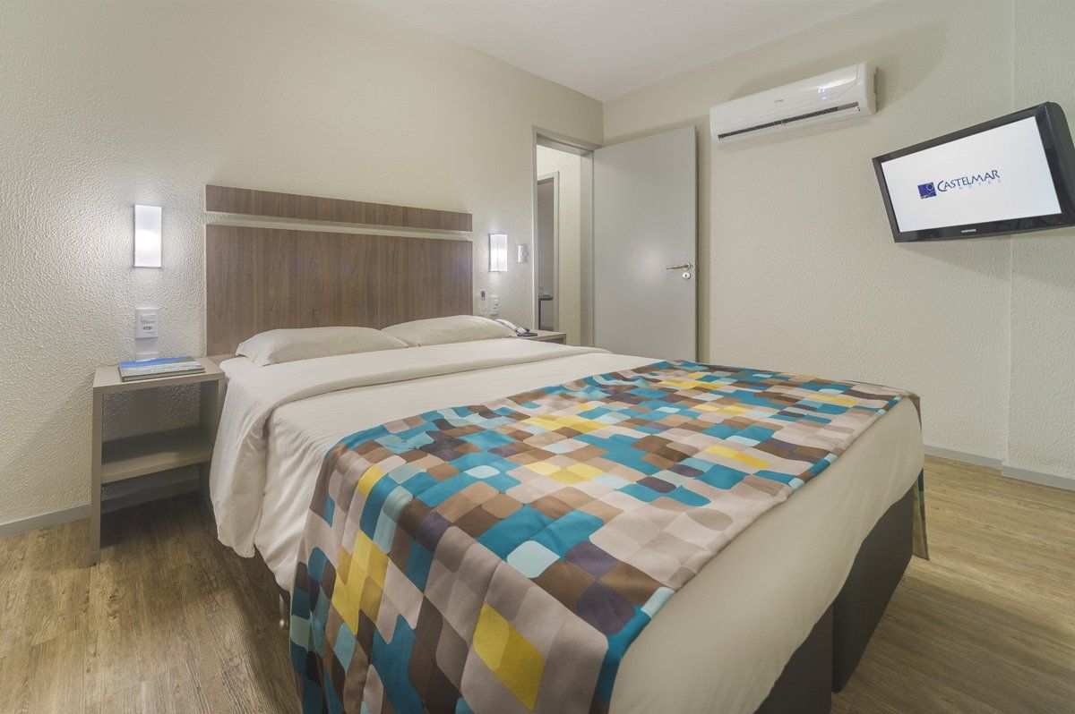 Essa categoria foi totalmente revitalizada. O apartamento Standard Plus tem 25m², acomoda até 02 pessoas em uma cama de casal ou duas de solteiro. A categoria tem piso vinílico, ar condicionado split e estação de trabalho.